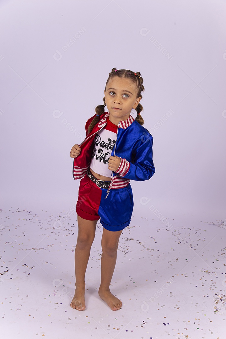 Criança fantasiada de Alerquina sobre um fundo isolado branco.