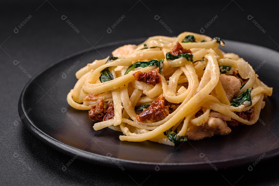 Deliciosa massa com espinafre, tomate seco, queijo, cebola, especiarias e ervas sobre um fundo escuro de concreto