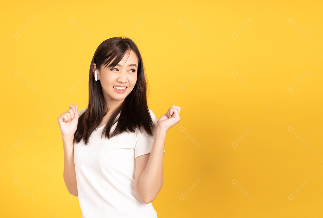 Jovem asiática com fones de ouvido ouvindo música com expressão alegre em fundo amarelo