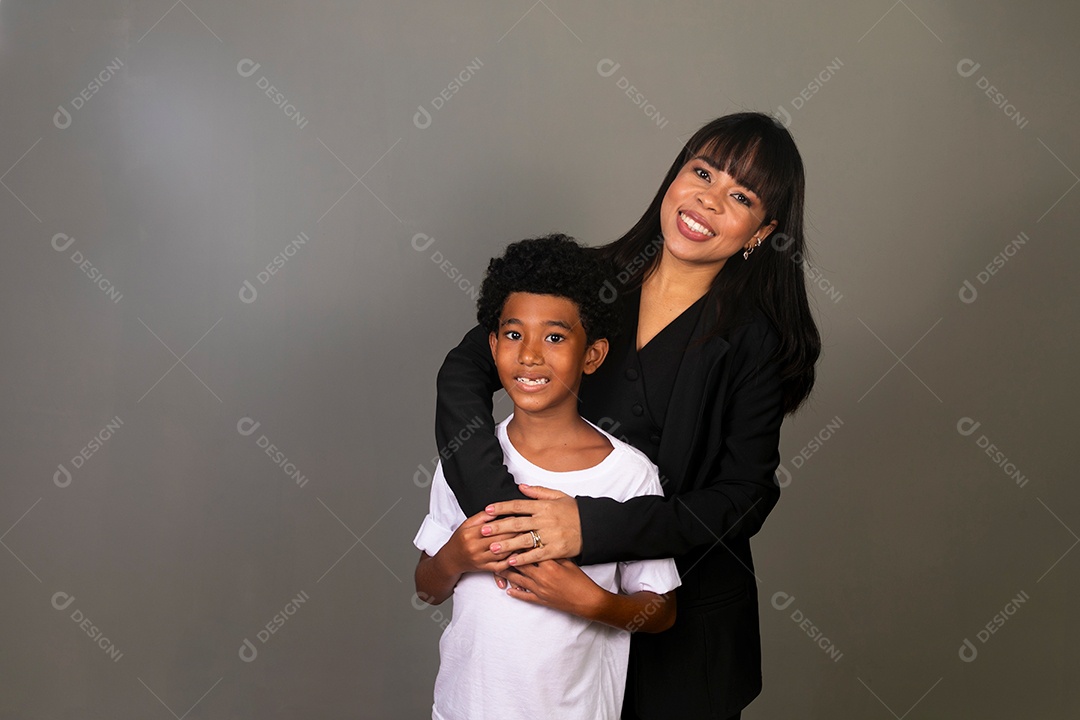 Linda mãe e filho negro se abraçando e sorrindo sobre fundo isolado