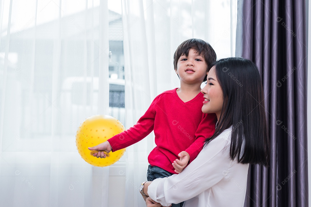 Mãe abraça e carrega seu filho. Preparando-se para mandar os filhos de volta à escola pela manhã.