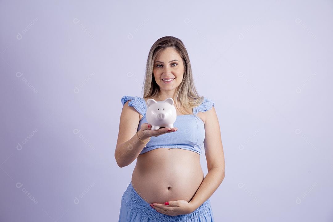 Linda mulher jovem grávida segurando cofrinho sobre fundo isolado