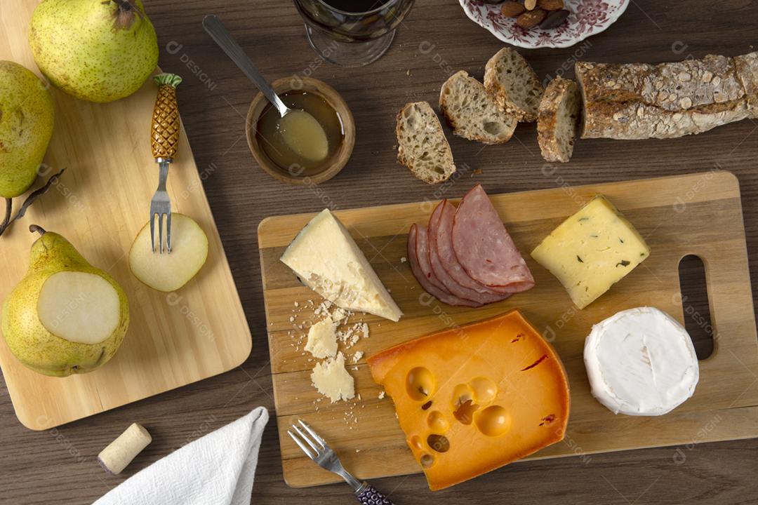 Queijo, presunto e peras sobre tábuas de madeira ao lado de pão fat...