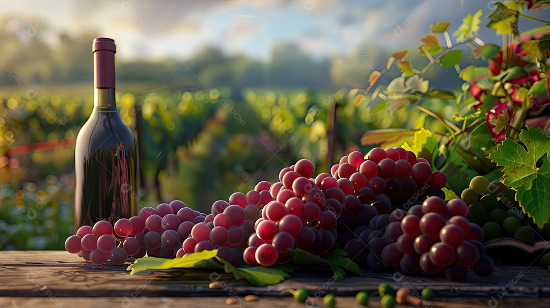 Cachos de uvas perto de uma garrafa de vinho sobre fundo desfocado de plantação