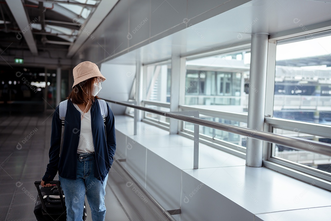Viajante usando máscara protetora com mala no conceito de aeroporto.