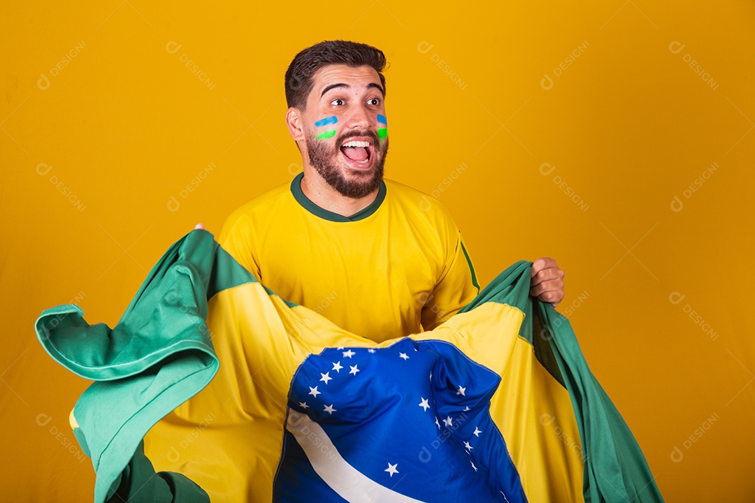 Homem jovem torcedor brasileiros sobre fundo isolado amarelo