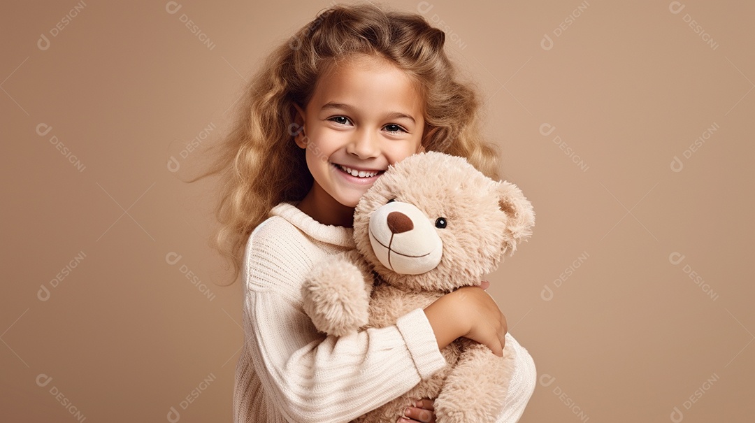 Garota branca em roupas casuais se diverte, abraça o ursinho de pel...