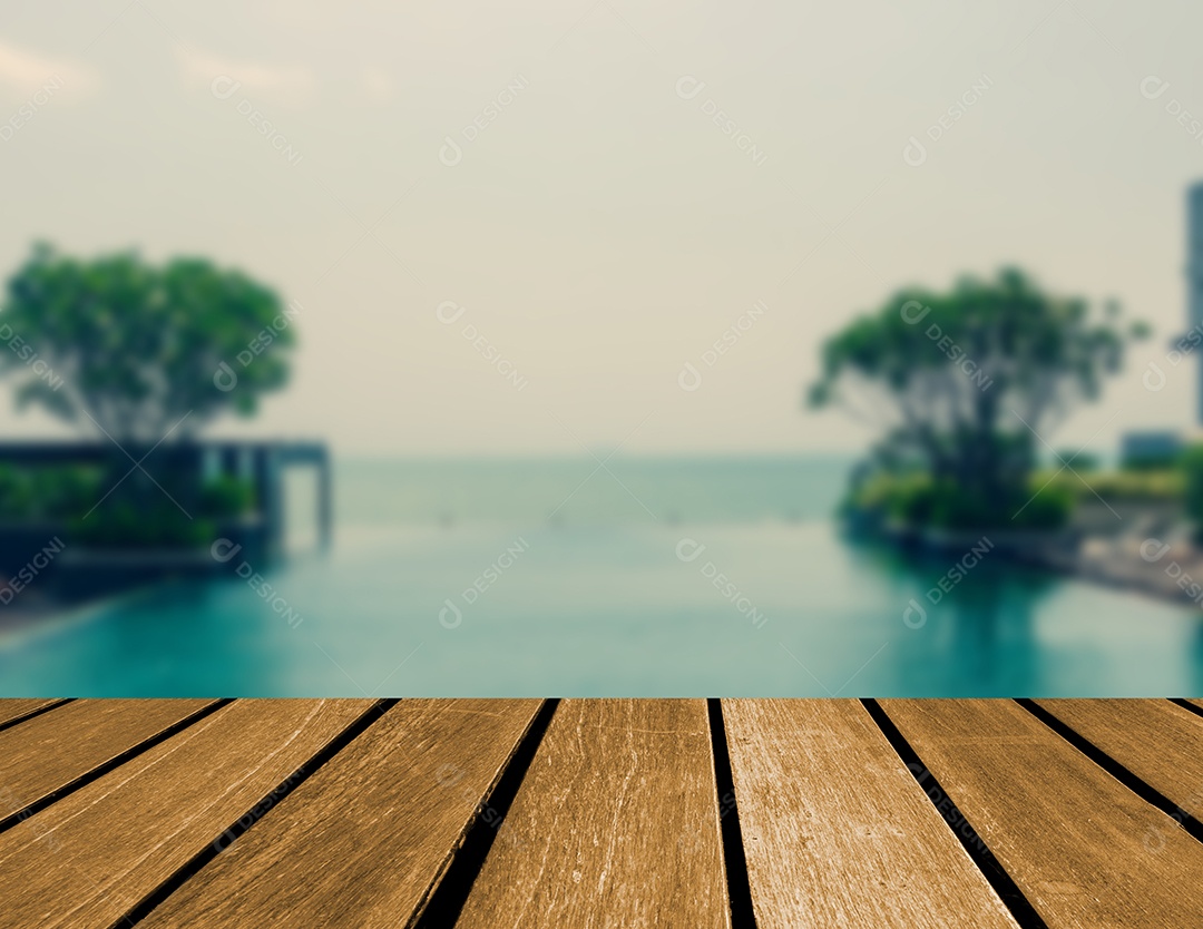 Mesa superior de madeira e piscina turva abstrata linda em resort tropical. Pode ser usado para exibir ou montar seus produtos.