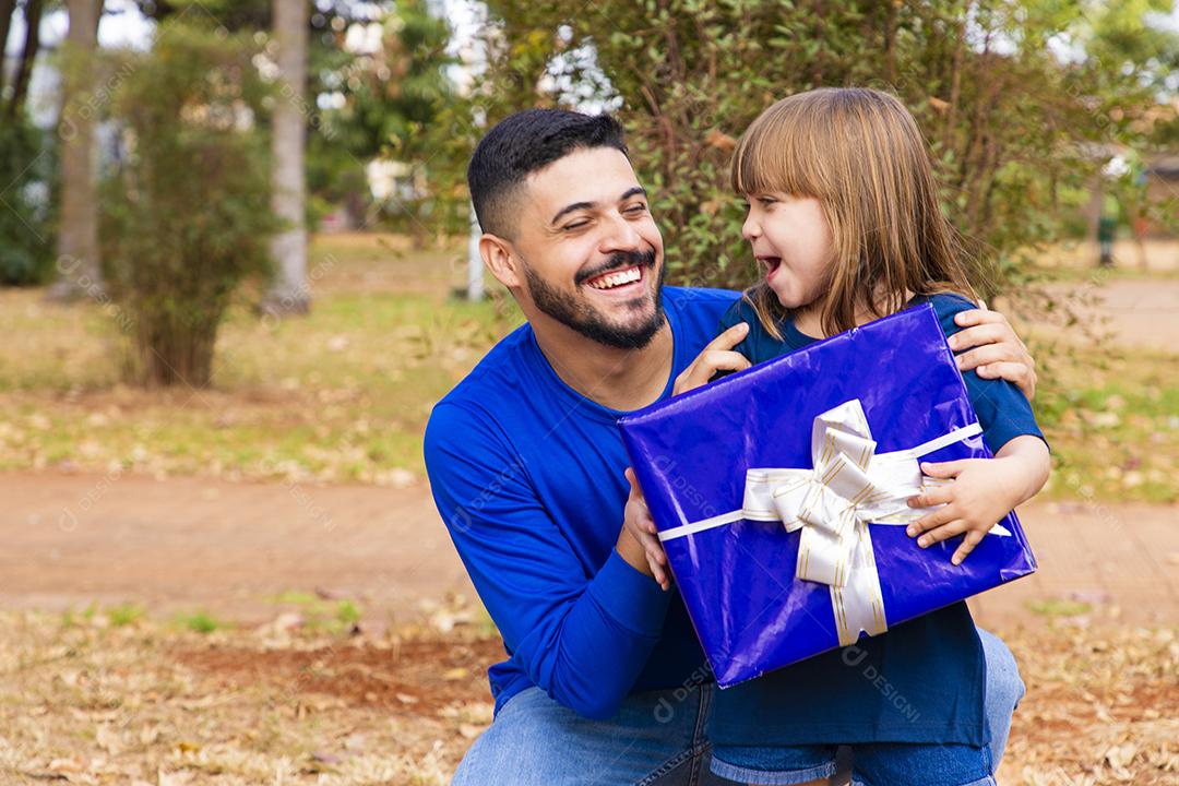 Este presente é para você. Retrato de menina amorosa ao lado do pai...