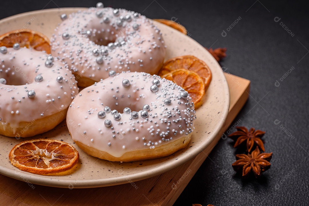 Delicioso donut fresco de cor branca ou bege com confeitos prateados