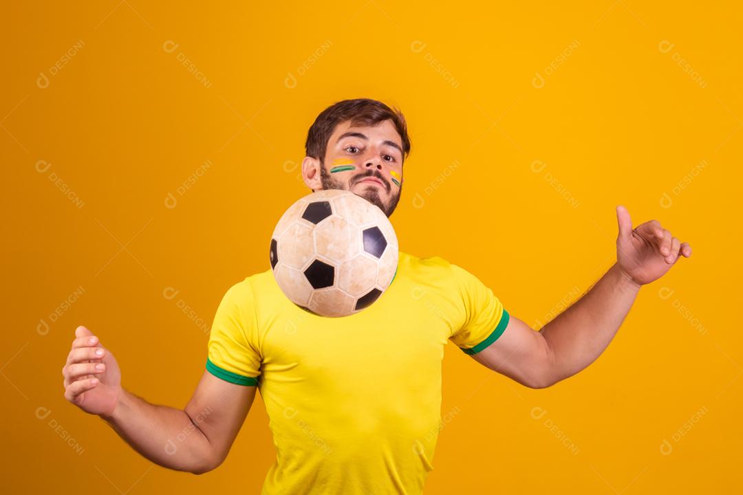Homem jovem torcedor brasileiro com uma bola de futebol