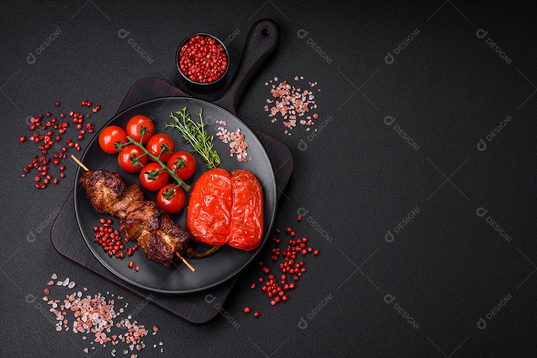 Deliciosos espetos de frango, peru ou porco grelhados com sal, especiarias e ervas no fogo sobre um fundo escuro de concreto