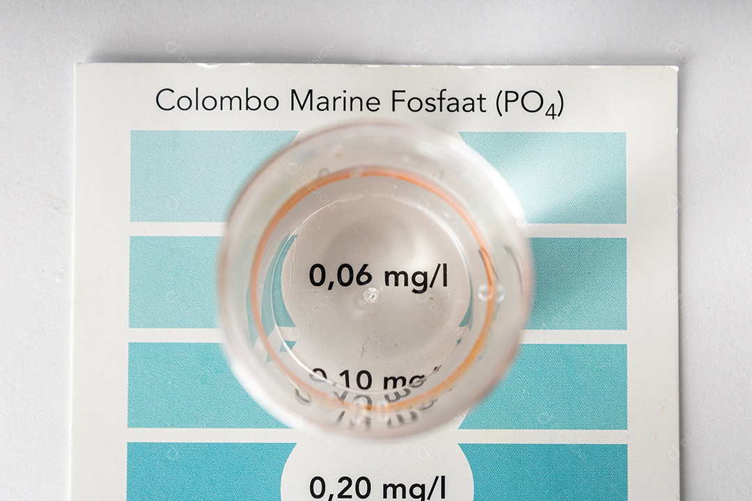 Teste de fosfato colorimétrico usado para medir o nível de fosfato na água do aquário marinho.