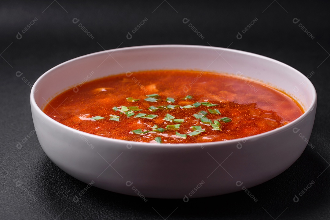 Delicioso borscht ucraniano fresco com beterraba, cenoura e repolho...