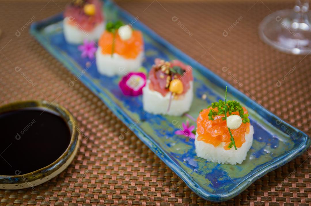 Delicioso sushi premium de salmão e atum Oshizushi em um prato de porcelana artesanal decorado.