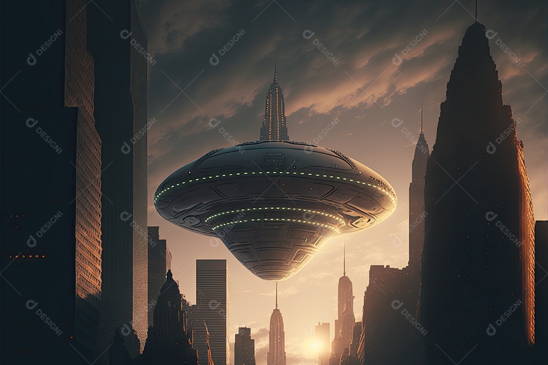 Ilustração de uma nave alienígena gigante sobre uma cidade