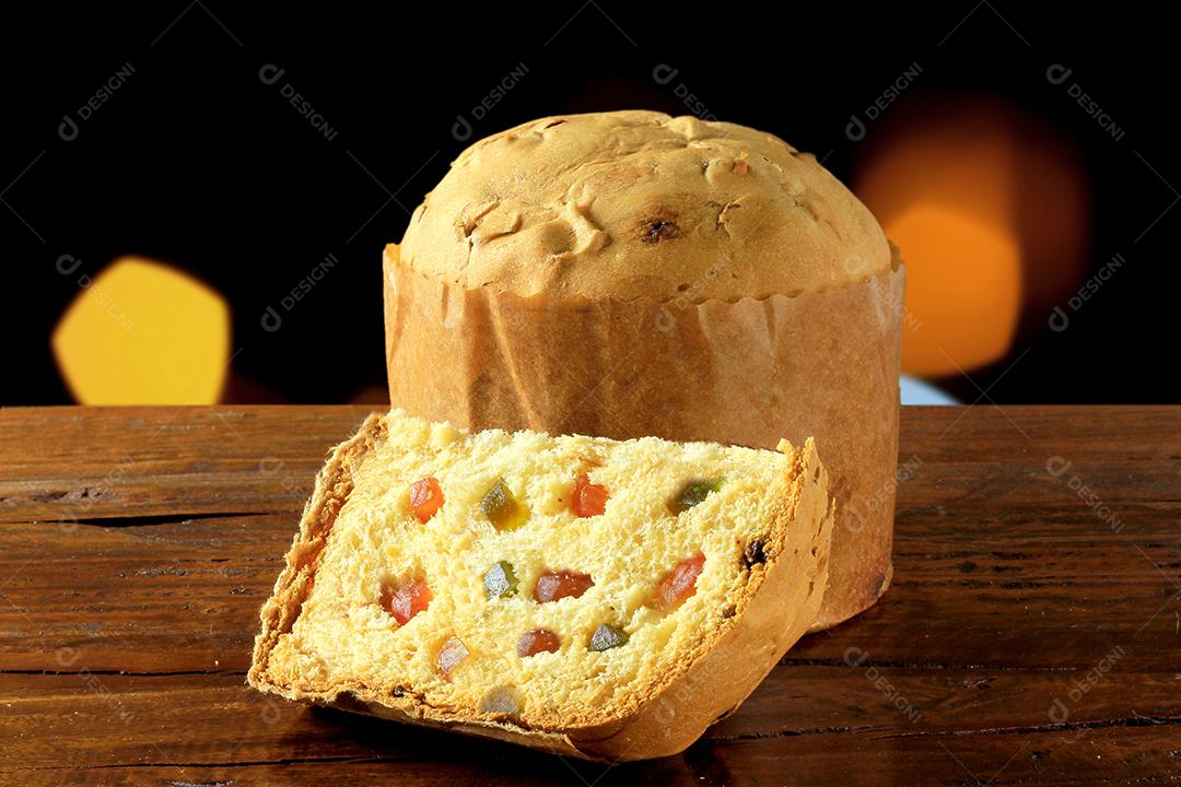 fatia de panetone com mesa de madeira de frutas cristalizadas