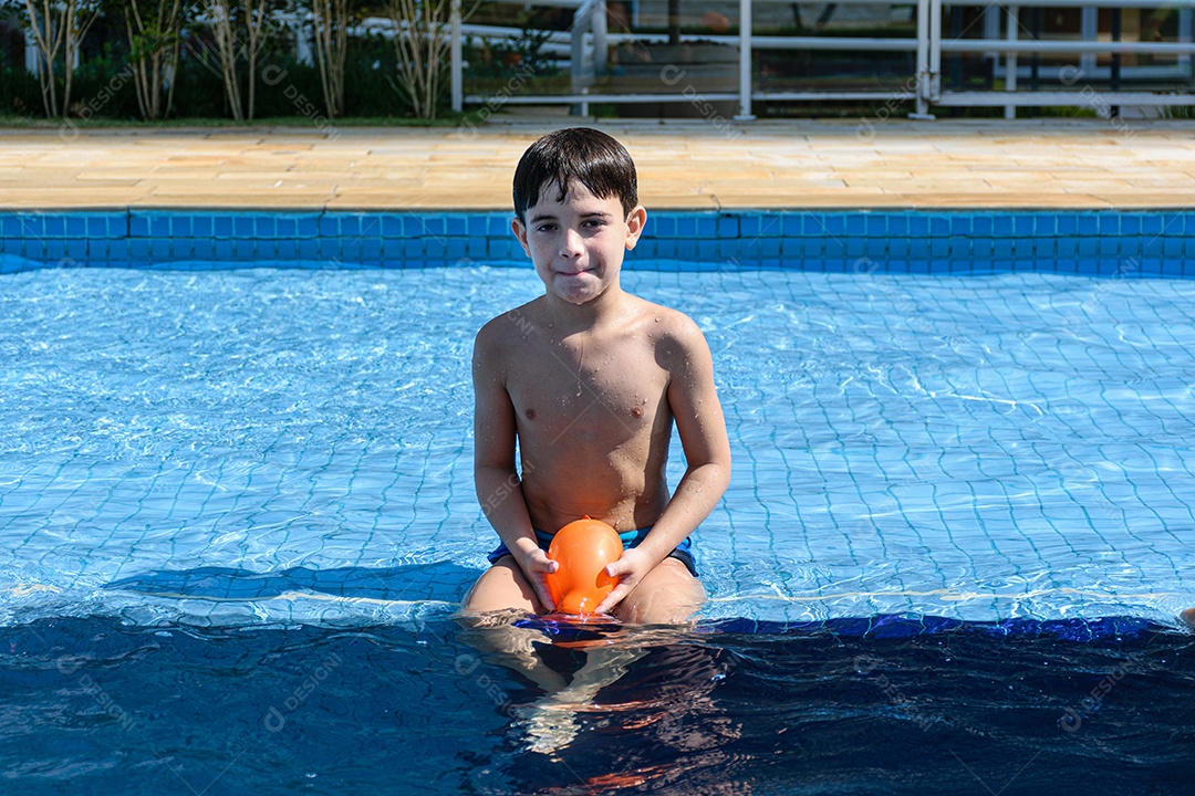 Criança de 8 anos sentada na beira da piscina, apertando os lábios e segurando uma bomba dágua.