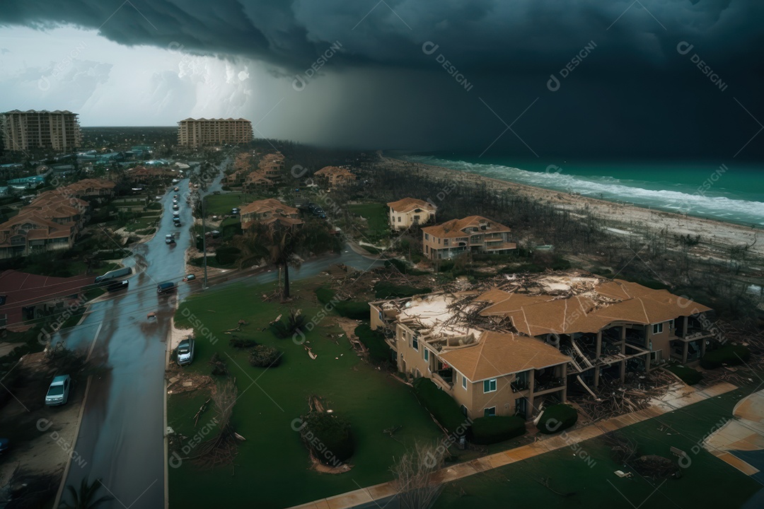 Furacão Tempestade de furacões destruindo grande parte da costa caribenha, ventos fortes, tsunamis, detritos, cidade destruída
