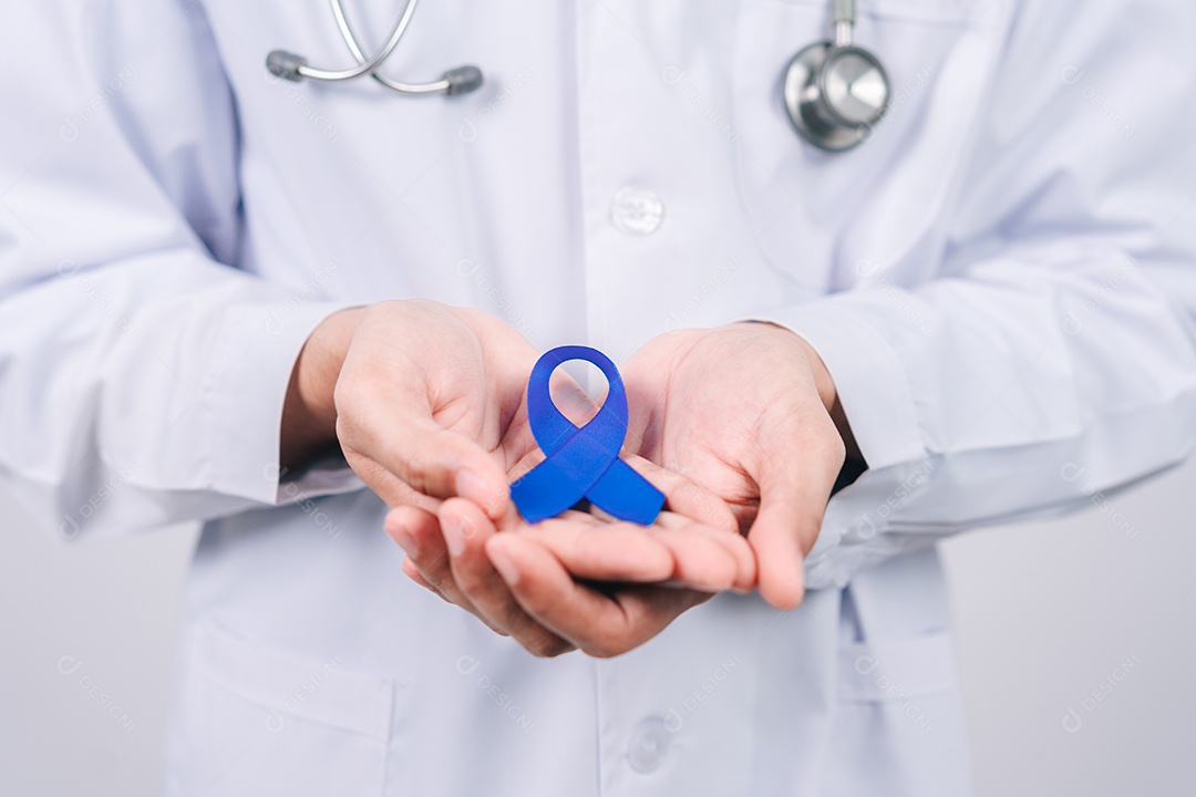 Médico em um jaleco branco mãos segurando fita azul para apoiar as ...