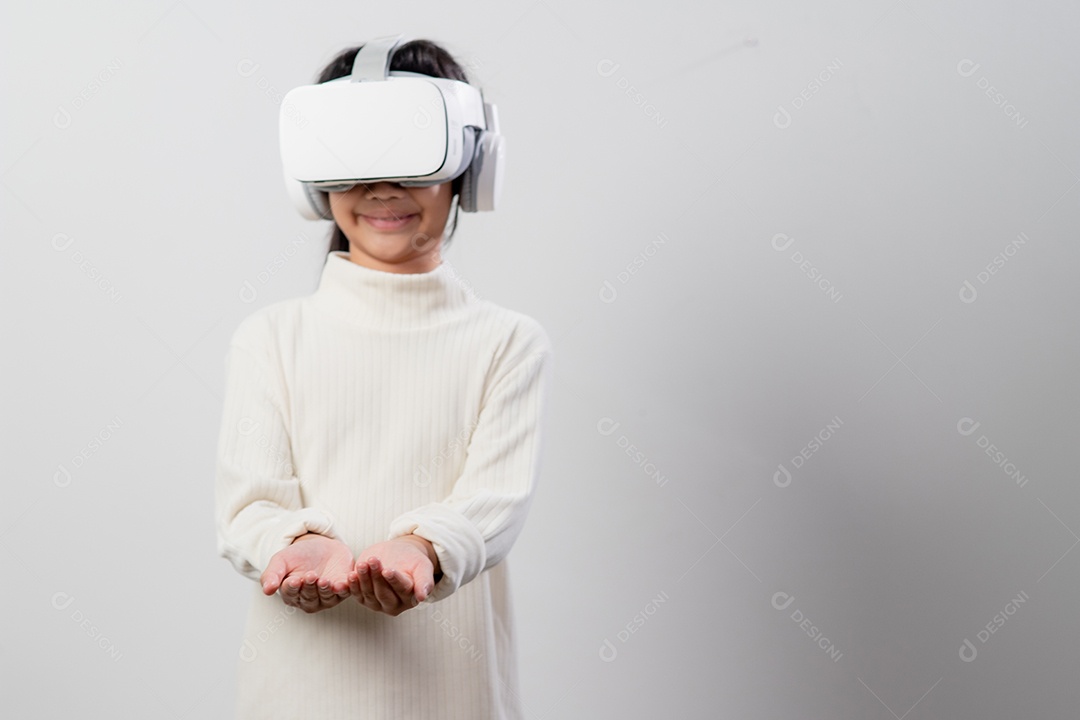 Menina asiática com fone de ouvido de realidade virtual. Tecnologia...