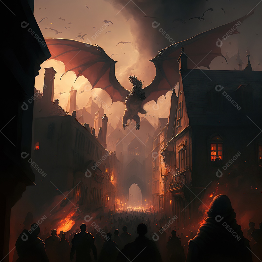 Dragão atacando a cidade em chamas. uma multidão de pessoas corrend...