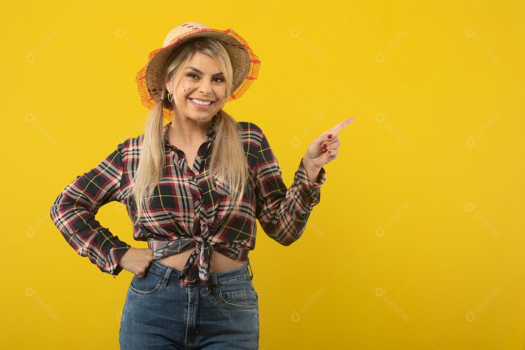 Linda mulher brasileira, com roupas de festa junina, em fundo amarelo.