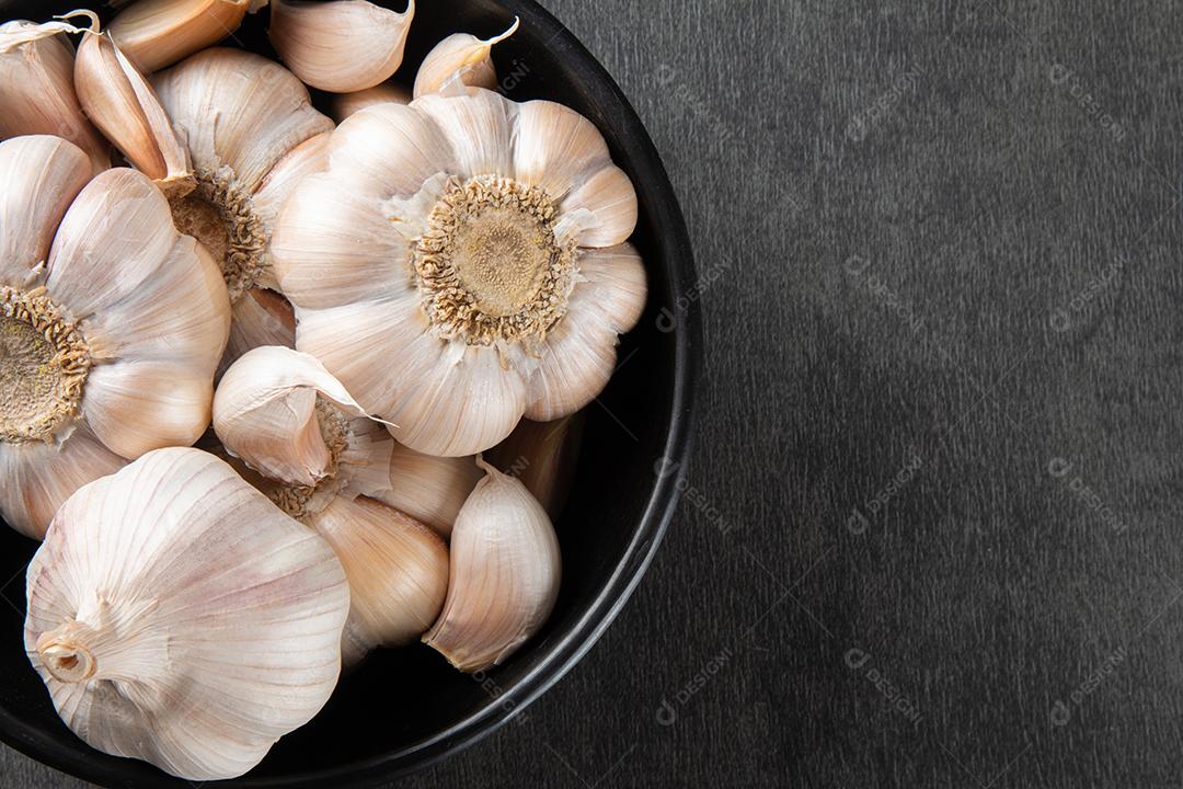 Dentes de Alho e Bulbo Em Tigela Preta Em Tecido e Fundo Escuro Imagem JPG