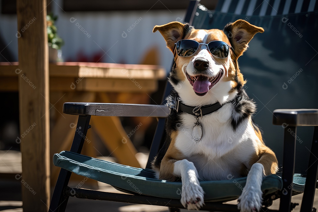 Um cachorro está parado em um jardim, usando um par de óculos de so...