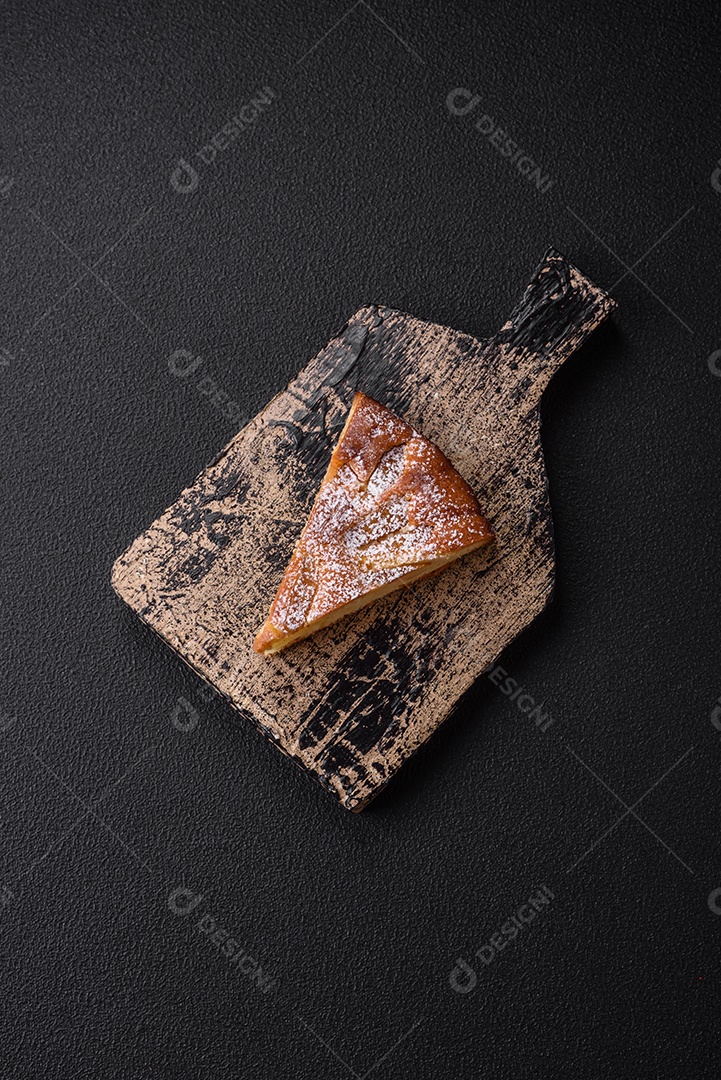 Um pedaço de torta caseira assada com maçã ou pêra, com canela, polvilhada com pó sobre um fundo escuro de concreto