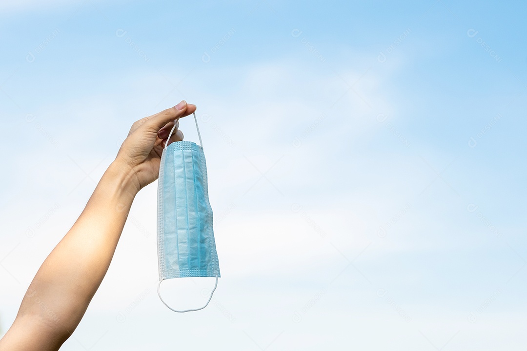Mão mostrando máscara facial médica protetora no fundo do céu, previne coronavírus ou doença do vírus Corona (Covid-19). novo normal e conceito de saúde