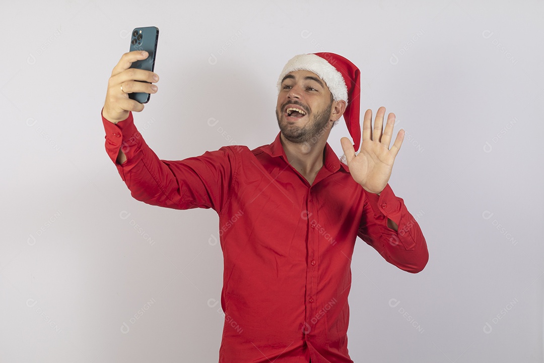 Homem jovem usando gorro Papai Noel segurando celular sobre fundo branco