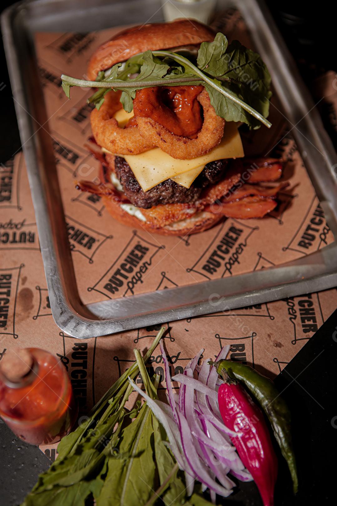 Hambúrguer ,carne grelhada, cheddar, bacon, queijo, molho branco.