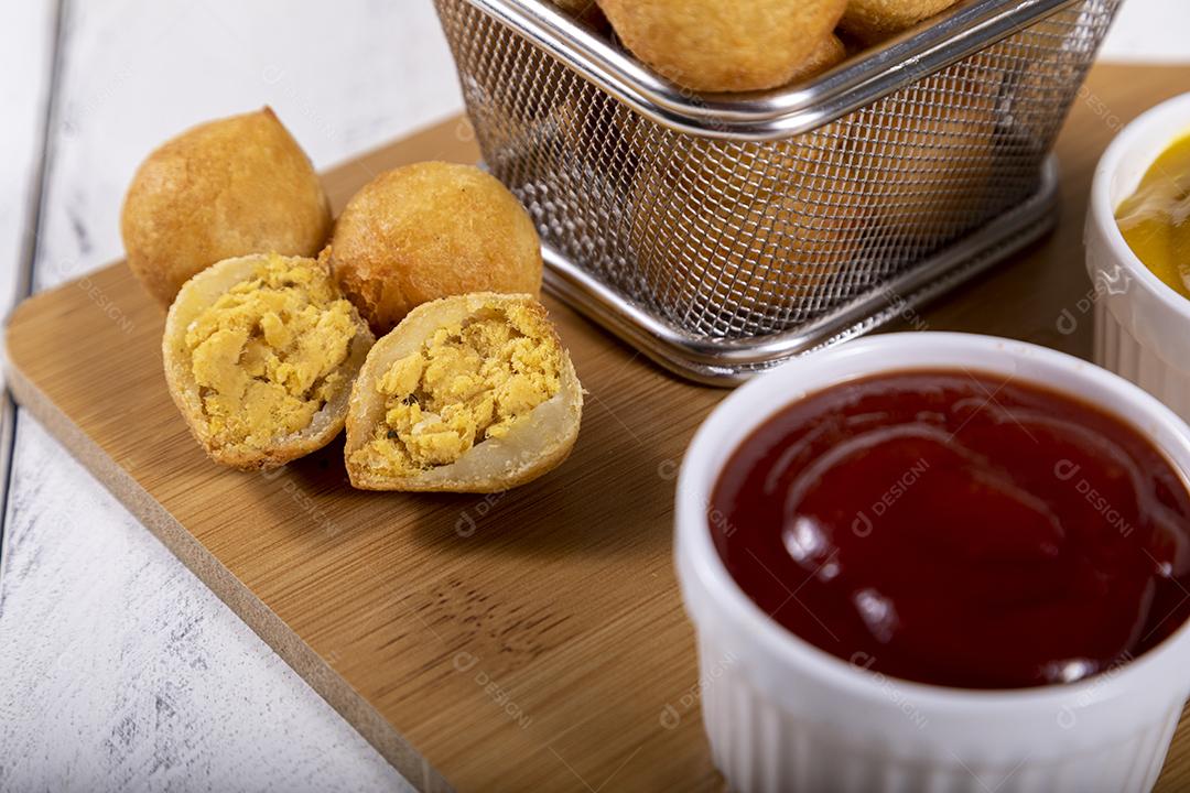 Salgados de frango fritos em tigela grade sobre fundo branco