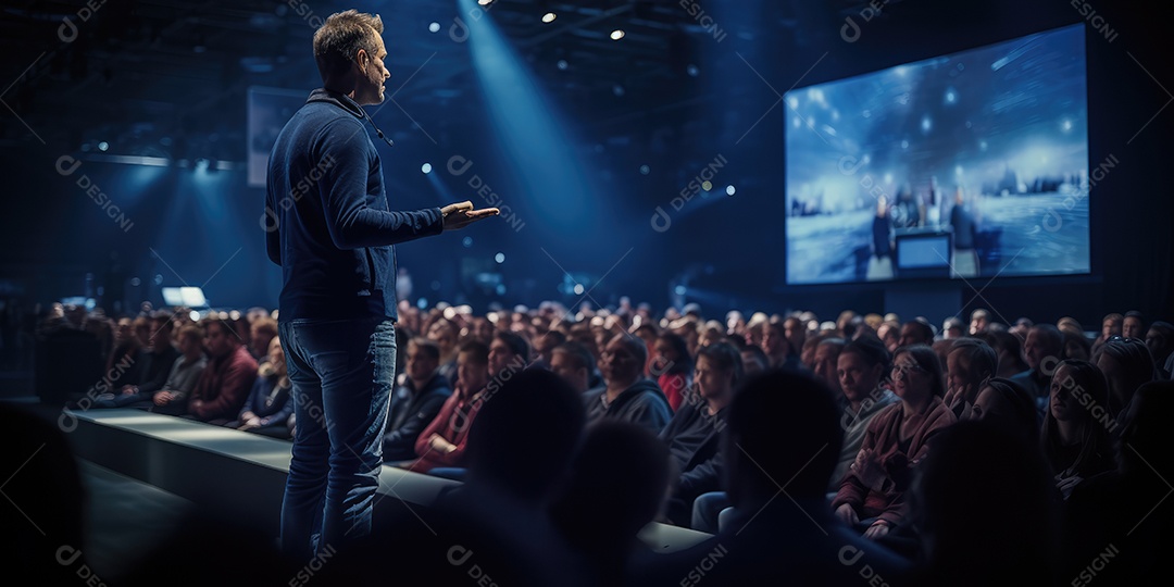 Palestrante se apresentando no palco com holofotes conversando com ...