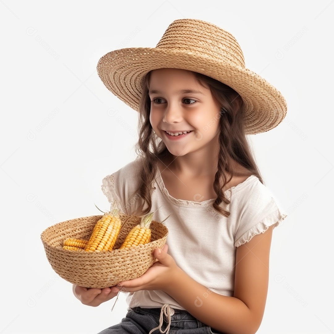 Menina feliz com chapéu de palha e milhos colhidos na fazenda isolado em fundo branco