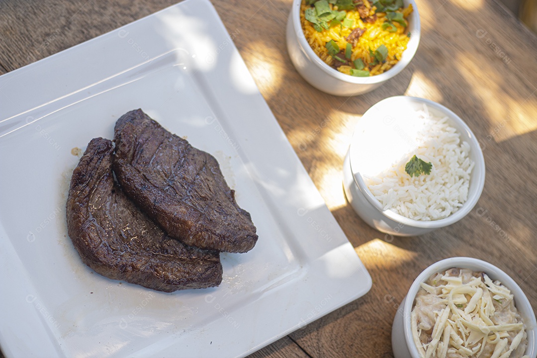 Carne assada suculenta servida em um prato branco com acompanhamentos