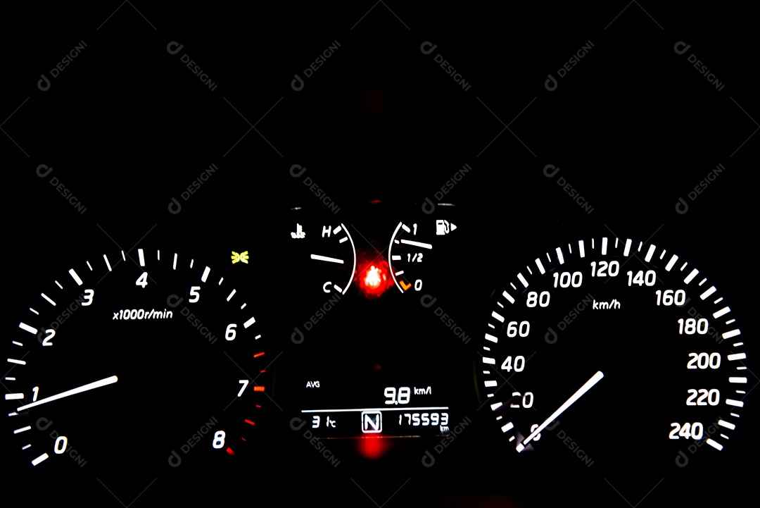 Automóvel do carro do velocímetro do painel à luz da noite.