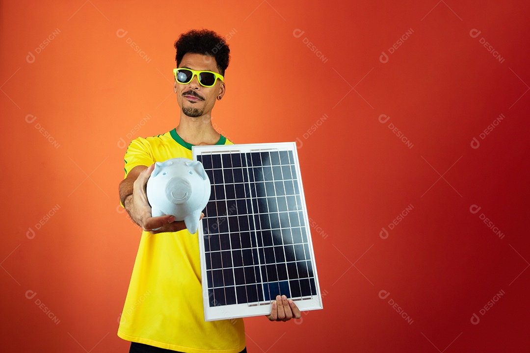 Jogador de futebol - homem negro comemorando segurando painel solar fotovoltaico e moeda de porco isolada em laranja